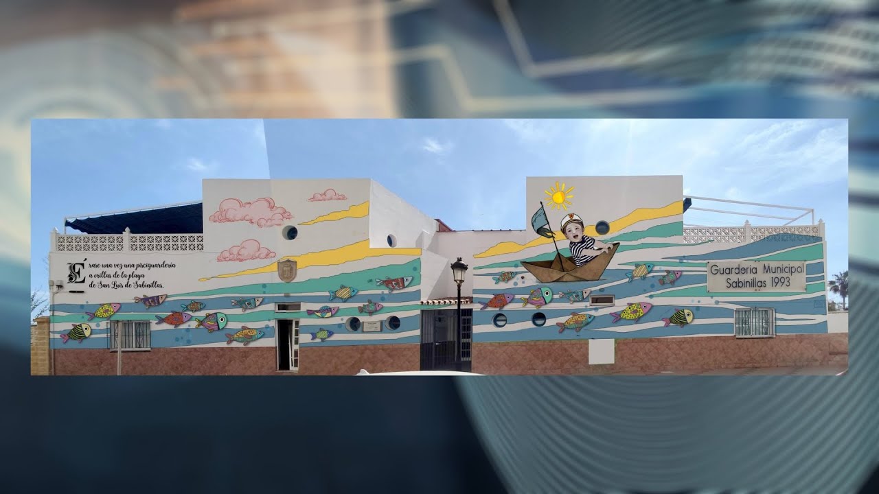 En la fachada de la Escuela Infantil, Gómez nos explica el mural que realizará la artista local, María José Gil Lozano y que vendrá a embellecer esta zona.