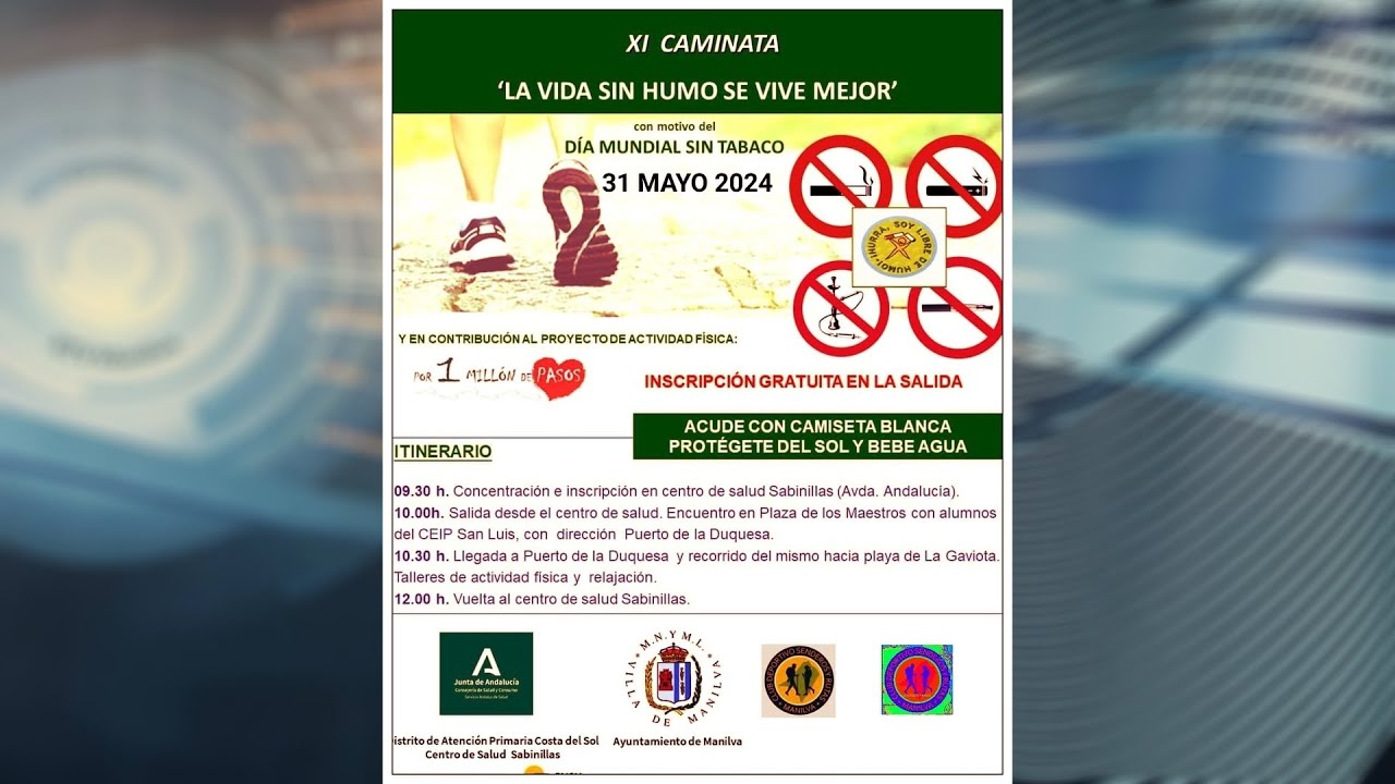 En nuestro municipio esta iniciativa, totalmente gratuita, está impulsada por la delegación de Salud, cuya responsable es Fina Gómez, que informa que la salida se producirá a las 9:30 h. desde el Centro de Salud de Sabinillas y en dirección al Puerto de La Duquesa.