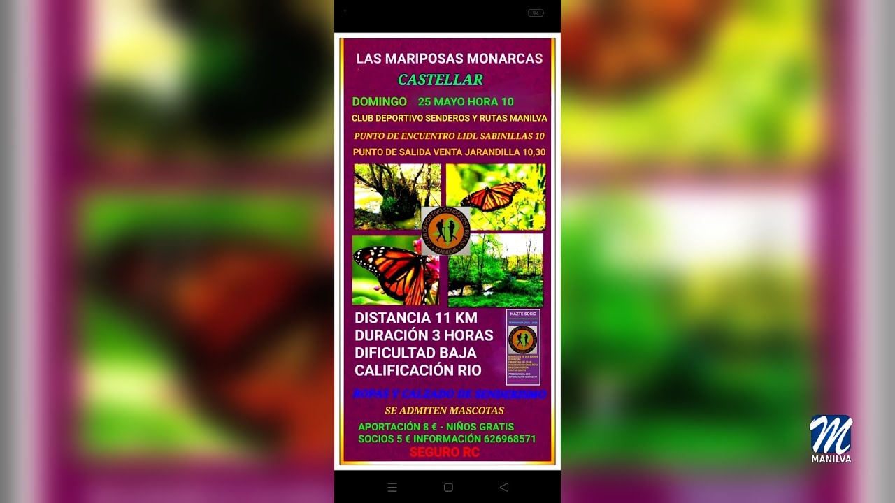 Este domingo 25 de mayo, el club de Senderos y rutas de Manilva nos lleva a Castellar a una ruta que tiene como objetivo el avistamiento de la mariposa comarca que mariposa monarca es autóctona de América y Castellar es uno de los pocos sitios de Europa en los que se puede ver, puesto que han creado una de las colonias más importantes del continente en torno al río Guadarranque. La ruta consta de 11km, es de dificultad baja y tiene una duración de 3 horas.