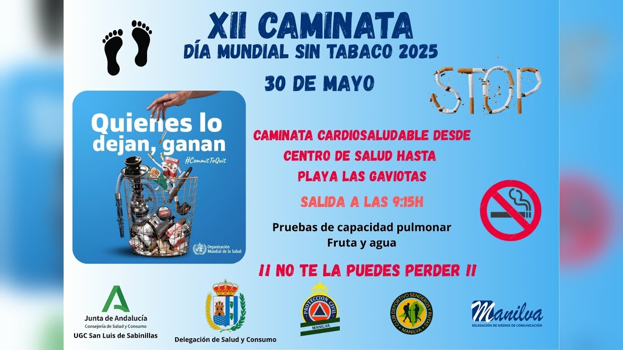 Mañana viernes día 30 de mayo pueden participar en la XII Caminata “Día mundial sin tabaco 2025”, impulsada por el Centro de Salud de Sabinillas y el área de Salud y Consumo del Ayuntamiento de Manilva, que dirige el concejal Juan Carlos Morejón.